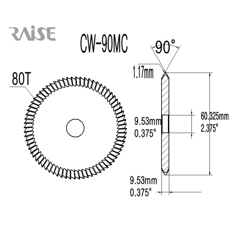 DiameterThicknessHole DiameterProfile / AngleItem No.TypeMaterialInchmmInchmmInchmmABF In.mmTCW-90MCMillingH.S.S.2.37560.32.3759.52.3759.524545.052F1.32RAISE High Quality CuttersThis cutter can be used on the following machines:Ilco Universal IIHPC 1200CML