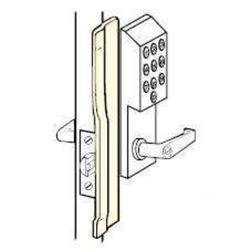 12-guage steel commercially rated latch guard in stainless steel (630) finish. Safeguards against someone knifing or prying out the latch, and separating the door from it’s frame.