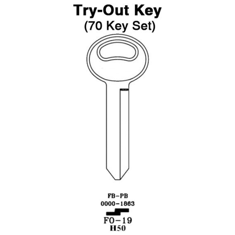 Tryout KeyProductTO-2Key Blank:H51Code Series:FB0-FB1863Space Cut:1-5Number of Keys:70Description:Works on all door locks from 1967 to about 1984. Some up until the early 1990'sSpecial Instructions:This set is loose in a box; simply try one key at a time i