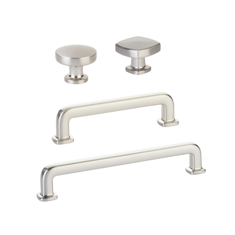 Collection of Elegance drawer pulls and cabinet knobs in a wide range of sizes in satin nickelwhich work perfectly as a drawer pulls and cabinet door handles. Comes with screws.DimensionsRound KnobDiameter: 1-1/4"Projection: 1"Square KnobDiameter: 1-1/8"Pr