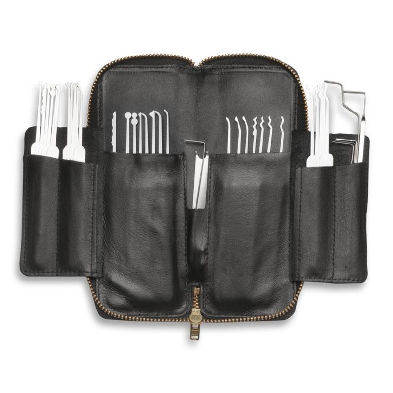 | Made for European and Japanese locks, and U.S. locks with small or narrow keyways, this SouthOrd Slim Line thirty-seven piece set includes fifteen picks with metal handles, fifteen standard picks, and seven different tension tools, housed in our luggage quality zippered top grain leather case. |