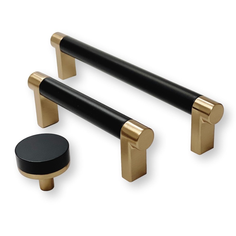 These beautiful champagne bronze and matte black dual-finish smoothbar cabinet knobs and drawer pulls are uniquely modern and will make a perfect design statement in any space.DimensionsRound KnobDiameter: 1-1/4"Projection: 1"Base Diameter: 3/8"3-1/2" Draw